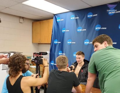 Dean Farris of Harvard fields questions from reporters about his record-breaking swim in the 200-yard open at the 2019 NCAA Division 1 Men’s Swimming and Diving Competition. Photo by Jane Kathleen Gregorio, EBC Texas Bureau, Eagle News Service.Dean Harris of Harvard swimming in lane five wins the heap and breaks the world record for the fastest 200-yard freestyle relay in the U.S. and NCAA. Photo by Jane Kathleen Gregorio, EBC Texas Bureau, Eagle News Service.Photo by Jane Kathleen Gregorio, EBC Texas Bureau, Eagle News Service.Townley Hass in lane two breaks the record for fastest 800-yard freestyle relay in the history of the NCAA. Photo by Jane Kathleen Gregorio, EBC Texas Bureau, Eagle News Service.