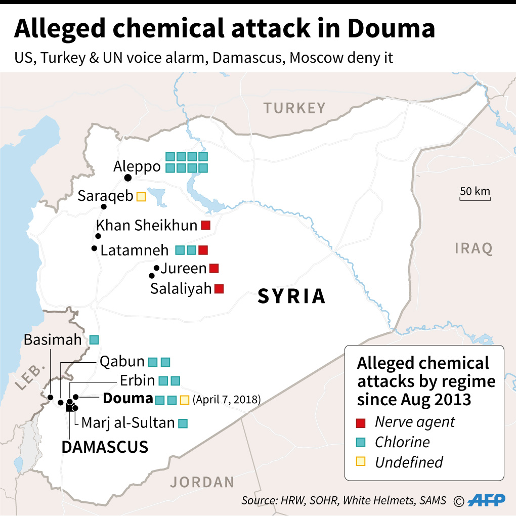 BEIRUT, Lebanon (AFP) — An alleged chemical attack in Syria’s rebel-held Douma has sparked international outrage, with Washington warning Sunday of possible military action, while Damascus and Moscow said the reports were mere “fabrications”.