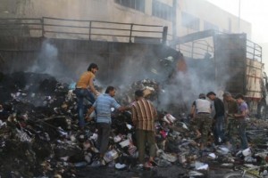 People salvage goods from an aid convoy that was damaged during an airstrike in the rebel held area of al-Sakhour district of Aleppo