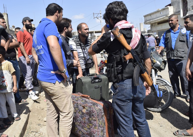 Under a deal with the Syrian government, an estimated 150 rebels and their families are being evacuated from Waer to northern parts of Homs province. UN organisations, which had helped oversee previous evacuations from Waer, were not involved in today’s operation, according to the Homs governorate. / AFP PHOTO / MAHMOUD TAHA