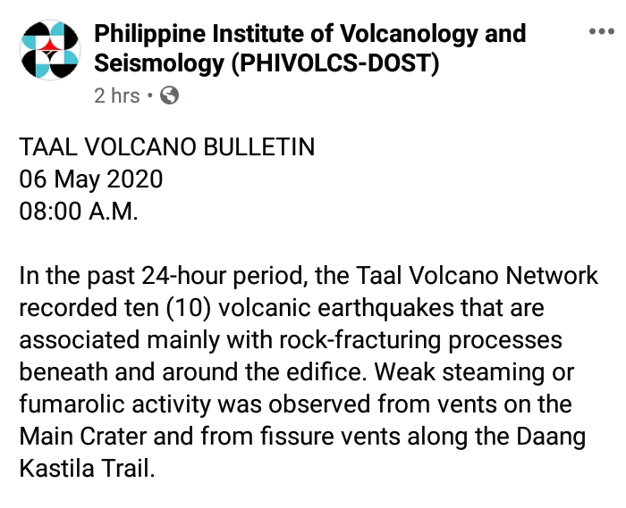 (Eagle News)–The Philippine Institute of Volcanology and Seismology on Wednesday, May 6, reported ten volcanic earthquakes at Taal in a 24-hour period.