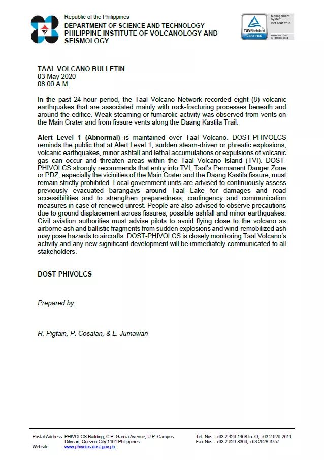 PHIVOLCS said it is still monitoring the Taal volcano, which remains on alert level 1.