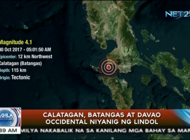 (Eagle News) — A 4.1-magnitude earthquake struck Batangas on Monday. The Philippine Institute for Volcanology and Seismology said the quake hit twelve kilometers northwest of the municipality of Calatagan at 5:01 in the morning. No aftershocks were expected.