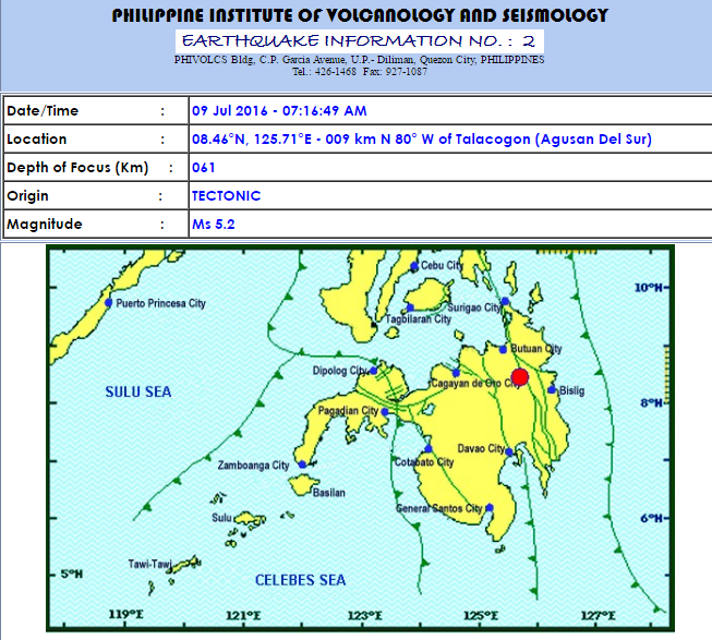 (Eagle News) – A magnitude 5.2 quake hit Agusan del Sur on Saturday morning (July 9), according to the Philippine Institute of Volcanology and Seismology (Phivolcs). The quake was felt at intensity 5 in Butuan City, and in Talacogon in Agusan del Sur; intensity 4 in Gingoog City, Misamis Oriental; intensity 3 in Cagayan de Oro City; and intensity 2 in Malaybalay City and Valencia in Bukidnon. The quake was of tectonic origin. Phivolcs […]