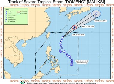 (Eagle News)–“Domeng” is expected to leave the Philippine Area of Responsibility between 6 a.m. to 10 a.m. today, June 10, but will continue to enhance the southwest monsoon, resulting in rains in some parts of the country. The Philippine Atmospheric, Geophysical and Astronomical Services Administration said the center of the severe tropical storm was near the borderline of PAR, 855 kilometers east northeast of Basco, Batanes, as of 4 a.m. “Domeng” is packing maximum […]