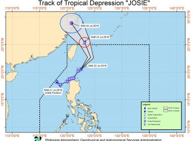 (Eagle News)–Tropical Depression “Josie” maintained its strength as it moved toward the Philippine Sea on Sunday, July 22, the Philippine Atmospheric Geophysical and Astronomical Services Administration said. PAGASA said as of 7 a.m., the center of “Josie” was situated 85 kilometers east northeast of Basco, Batanes. “Josie” is packing maximum sustained winds of 60 kilometers per hour near the center, and gustiness of up to 75 kilometers per hour. Batanes and the Babuyan Group of […]