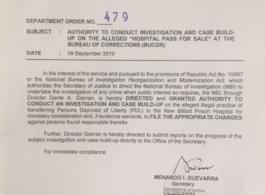 (Eagle News)–Justice Secretary Menardo Guevarra has ordered the National Bureau of Investigation to probe the reported sale of hospital passes to inmates at the New Bilibid Prison. The order came following a GMA news report that said the passes were sold by BuCor officers to inmates who wish to temporarily get out of jail. The report said the fee included a medical record that would make it appear that the inmate is sick and should […]