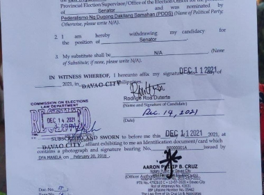 (Eagle News) — President Rodrigo Duterte went to the Commission on Elections (COMELEC) office in Manila on Tuesday afternoon, Dec. 14, to withdraw from the 2022 senatorial race, a few hours after his former long-time aide, Senator Christopher “Bong” Go withdrew his bid for the presidency. President Duterte filed his certificate of withdrawal with the COMELEC office. In the certificate, it showed December 11, 2021 as the date when it was prepared and subscribed […]