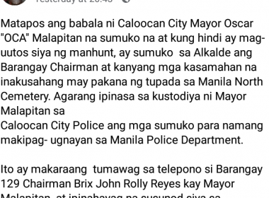 (Eagle News)–Some of the Caloocan barangay officials, including the chair, who were allegedly behind an illegal cockfighting activity in a cemetery amid the enhanced community quarantine, have surrendered. The Caloocan government said Barangay 129 chair Brix John Rolly Reyes surrendered to Mayor Oscar Malapitan a day after he urged them to give up for allegedly holding the illegal activity in the Manila North Cemetery. Malapitan transferred custody of the officials to the local police which […]