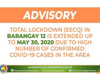 (Eagle News)–The lockdown of Barangay 12 in Caloocan City has been extended to May 30. In a Facebook post, Caloocan Mayor Oscar Malapitan said the extension was due to the continued rise in the number of COVID-19 cases there. Based on latest data, the barangay has 49 cases, which means it has the most cases in the city so far. The lockdown, which was imposed on May 17, was supposed to be lifted on May […]
