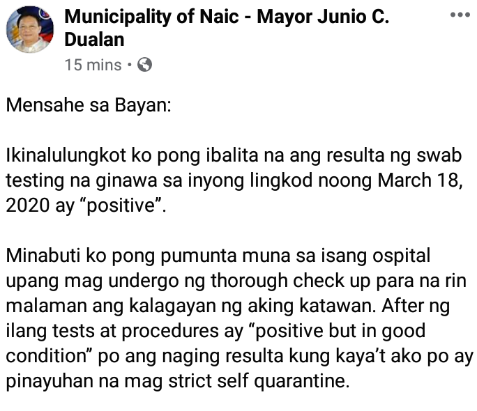 (Eagle News)--The mayor of Naic, Cavite has tested positive for the coronavirus disease 2019. Mayor Junio Dualan made the announcement…