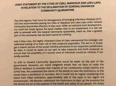 (Eagle News)–The cities of Cebu, Mandaue and Lapu Lapu have asked the Inter-Agency Task Force for the Management of Emerging Infectious Diseases they be allowed to remain under an enhanced community quarantine. A joint statement from Mandaue Mayor Jonas Cortes, Cebu City Edgardo Labella and Lapu-Lapu City Mayor Junard Chan said while easing restrictions would mean a “semblance of normalcy,” it would “not be logical” since based on initial estimates, approximately 90 percent of cases […]