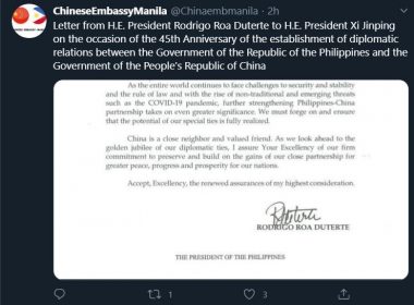 (Eagle News) — President Rodrigo Duterte has assured China of the Philippines’ commitment to maintain ties amid the challenges. The President gave the assurance in a June 9 letter to Chinese President Xi Jinping on the occasion of the 45th anniversary of diplomatic relations between the two countries. “As the entire world continues to face challenges to security and stability and the rule of law, and with the rise of non-traditional and emerging threats such […]