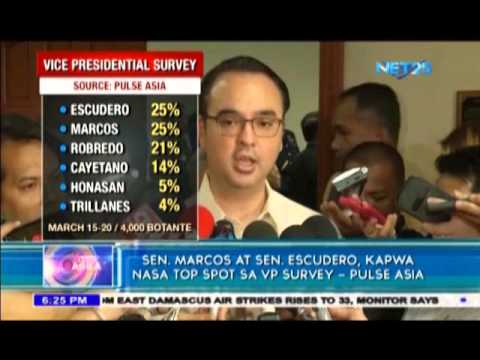 MANILA, Philippines – In the latest survey conducted by Pulse Asia, Senator Bongbong Marcos and Senator Chiz Escudero shared the top spot as forerunners for the candidates for vice-president in the 2016 elections. Both senators garnered 25%. Congresswoman Leni Robredo is at second place. (Eagle News Service Described by Jay Paul Carlos, Video Editing and Uploaded by Vince Alvin Villarin)