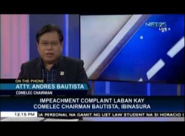 (Eagle News) — Commission on Elections Chair Andres Bautista viewed as “unfortunate” the decision of the House of Representatives that voted to impeach him, saying it was an “unnecessary move.” In a statement, Bautista also acknowledged that the lawmakers were “entitled to their own opinion,” and said that he will abide by the rules on the impeachment process. “It is unfortunate that the decision of the House Committee on Justice, which was voted upon […]