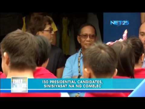 The Commission on Elections (COMELEC) will conduct examination of the 130 candidates for presidency in the 2016 elections with 125 of the candidates to be subjected to a series of hearings to find out if they have the capability to run for presidency. If a candidate fails to pass said hearing, they will be declared nuisance candidates. (Eagle News Service Described by Jay Paul Carlos, Video Editing by Dexter Magno, Uploaded by MRFaith Bonalos) https://youtu.be/hix2Sa4YdYs