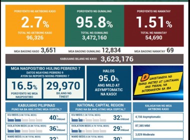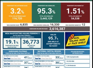 95 percent of active cases still either mild or asymptomatic (Eagle News) – The country’s total active Covid-19 cases dropped below the 100,000 mark for the first time in a month, hitting only 96,326 on Wednesday, February 9. The last time that total active cases were below 100,000 was on January 7 at 77,369 cases. On Tuesday, February 8, the total active cases were 105,550. New cases today, February 9, reached 3,651. This is […]