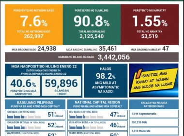 (Eagle News) – The Department of Health (DOH) reported 24,938 new Covid-19 cases on Monday, January 24, the third straight day that the country posted decreasing new virus cases. On Sunday, January 23, new virus cases hit 29,828. On Saturday, January 22, new cases were 30,552, which were less than Friday’s (January 21) 32,744 new cases. There were also more Covid-19 new recoveries than new cases on Monday. New recoveries hit 35,461; this is […]