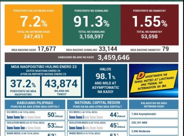 New recoveries outnumber new Covid cases for fifth straight day (Eagle News) – The Department of Health reported 15,789 new Covid-19 cases and 32,712 new recoveries on Wednesday, January 26. Since January 22, there has been a decreasing trend in cases, thus the fifth straight day that new virus cases have been decreasing, and coincidentally the fifth day too that there are more Covid recoveries compared to new cases. Because of this, total active […]