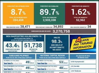 Number of new cases is also below 30k for the first time in almost a week (Eagle News) – The number of COVID-19 recoveries on Tuesday, January 18, reached 34,892, the first time that the new recoveries were higher than new COVID-19 cases this year. The new COVID-19 cases were 28,471, the first time in almost a week that new COVID-19 cases were not above 30,000. The last time that new COVID-19 cases were […]