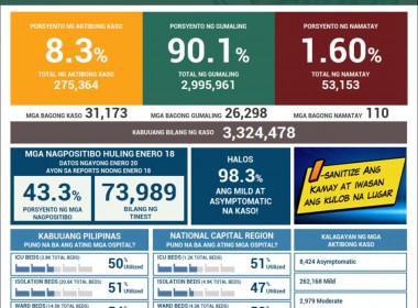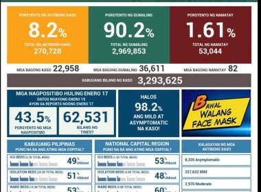 New COVID-19 cases reach 22,958, much lower than previous day’s 28,471 (Eagle News) — For the second straight day, new COVID-19 recoveries exceeded the number of new virus cases on Wednesday, January 19, 2022. New recoveries reached 36,611 while new cases were only 22,958. The new recoveries on Wednesday, January 19, were even higher compared to Tuesday’s (Jan. 18) number of 34,892. The new cases today were also lower than the previous day’s record […]