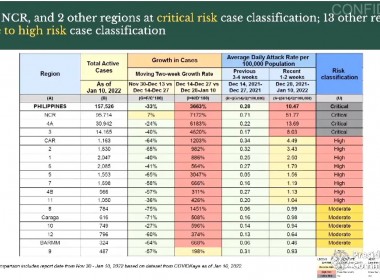 1,475 percent two-week growth rate for COVID-19 observed in Metro Manila (Eagle News) – The Philippines is now at a high-risk classification for COVID-19 due to a 448 percent two-week growth rate, with Metro Manila considered at critical risk, Health Secretary Francisco Duque III said. During President Rodrigo Duterte’s Talk to the People, Duque noted the spike in COVID-19 cases as local transmission of the Omicron variant has been confirmed and after the increase […]