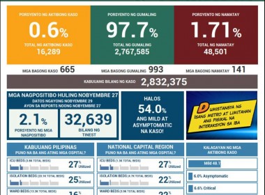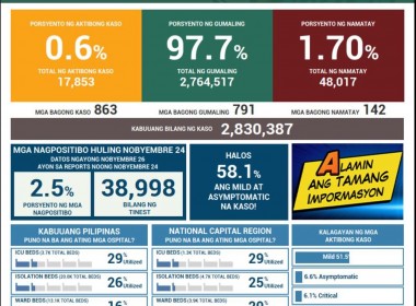 Total active cases at 17,853 or 0.6 percent of total COVID cases (Eagle News) – The Philippines reported 863 new COVID-19 cases, the second lowest number of new cases in a day for this month. The single-day lowest number of new cases was 849 recorded last Nov. 16. Total active cases reached 17,853 as of Friday, November 26, or just 0.6 percent of total COVID cases for the third straight day. This is so […]