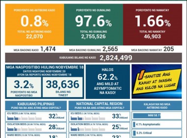 Total active cases just 0.8 percent of country’s total cases for 4th straight day (Eagle News) – The total number of active COVID-19 cases in the country has gone down to just 22.070 as more COVID-19 recoveries continue to be posted compared to those compared to new virus cases. The active cases just constitute 0.8 percent of total COVID-19 cases which as of Saturday, Nov. 20, stood at 2,824,499. This is the fourth straight day […]