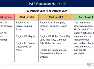 (Eagle News) — Malacanang announced the expansion of the alert level system in more areas of the country which will be in effect starting Wednesday, Oct. 20 until Oct 31. Under Alert Level 4 are Negros Oriental in Region 7 (Central Visayas), and Davao Occidental in Region 11 (Davao Region). Under Alert Level 3 are six areas, namely Cavite, Laguna, Rizal in Region 4-A; Siquijor in Central Visayas (Region 7); and Davao City and […]