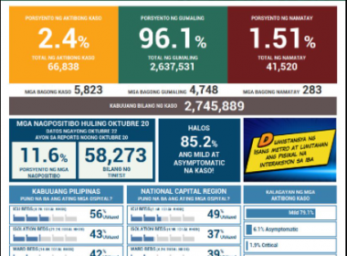 (Eagle News) — The Philippines recorded 5,807 new COVID-19 cases and 9,578 new recoveries on Saturday, Oct. 23. This brought the number of active cases down to 63,501, much lower than Friday’s 66,838. Because of this, the percentage of active cases has gone down to just 2.3 percent while total recoveries increased to 2,647,031 or 96.2 percent of the total Covid cases. Total Covid infections reported since the pandemic reached 2,751,667. New deaths reported […]