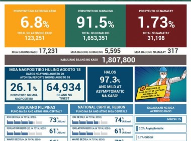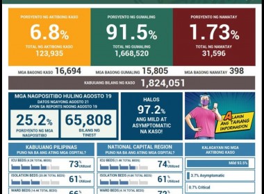 (Eagle News) – COVID-19 deaths recorded on Saturday, Aug. 21, rose to 398 from Friday’s record of 317 as the Philippines reported 16,694 new COVID cases. Total active cases reached 123,935 as of Saturday, or 6.8 percent of total 1,824,051 confirmed cases. Most of the confirmed cases in the country are tagged as recoveries at 91.5 percent. This is equivalent to 1,668,520 cases. Most or 97.2 percent of the 123,935 active cases are […]