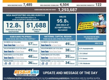 (Eagle News) — COVID-19 cases in the Philippines climbed to 1293687 after the Department of Health reported 7485 additional cases. The DOH said of the total cases, 56921 were active. Of these, 92.6 percent were mild, 3.2 percent asymptomatic, 1.3 percent critical, 1.3 percent severe, and 1.18 percent were moderate. Recoveries rose to 1214454 including the additional 4504 recoveries. The death toll is now at 22312, including the 122 deaths. The Philippines’ vaccination drive is […]