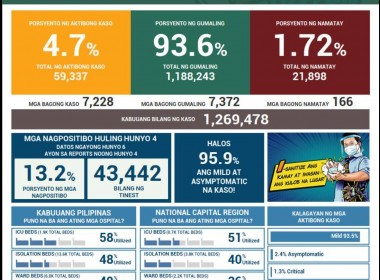 NCR still the region with most no. of active cases at over 11k, according to DOH data (Eagle News) – New COVID-19 cases continued to rise as 7,228 new infections were reported on Sunday, June 6. This brought the number of total active cases to 59,997, or 4.7 percent of the total number of confirmed cases (1,269,478). On Saturday, June 5, there were 6,955 new Covid cases reported. It was even higher at 7,450 […]