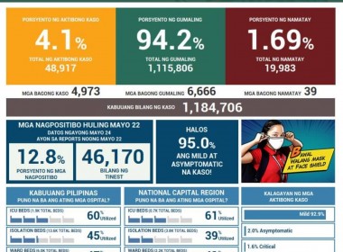 Percentage of total active cases at 4.1 percent, the lowest so far this year (Eagle News) – The Department of Health (DOH) announced the addition of 4,973 new COVID-19 cases in the country on Monday, May 24, bringing to 1,184,706 the total COVID cases in the country. The number of new cases was higher than Sunday’s 3,083 reported cases. But the total active cases in the country dropped to only 48,917 cases (from Sunday’s […]