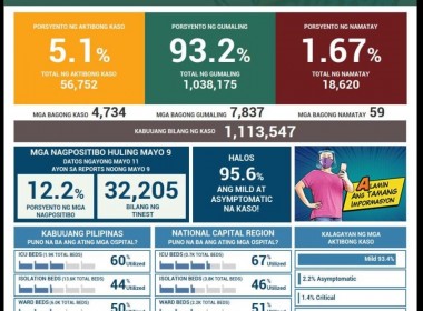 4,734 new cases, 7,837 new recoveries posted; Total recoveries reach 1,038,175 (Eagle News) – The number of new COVID-19 infections dropped to 4,734 on Tuesday, May 11, bringing the percentage of active cases to just 5.1 percent. Total active cases reached 56,752 while total recoveries were 1,038,175 or 93.2 percent of total cases. New recoveries added were 7,837. Total COVID-19 cases reached 1,113,547. According to the Department of Health, most of the active cases […]