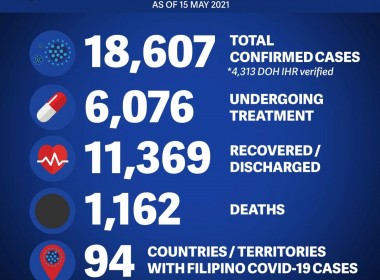 (Eagle News) — COVID-19 cases in the Philippines reached 1124724 on Thursday, May 13, after the Department of Health reported 6385 additional cases. The DOH said of the total cases, 55260 were active. Of these, 93.3 percent were mild, 2.2 percent asymptomatic, 1.4 percent critical, 1.9 percent severe, and 1.18 percent were moderate. Over 4000–or 4289–additional recoveries pushed the recovery total to 1050643. The death toll is now at 18821, including the 107 additional ones. […]