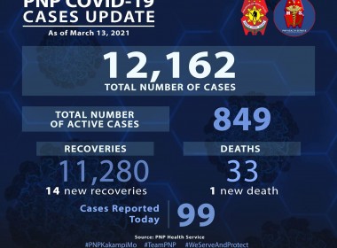 (Eagle News)–Ninety-nine more police personnel have tested positive for COVID-19. Philippine National Police data said the additional cases pushed the PNP COVID-19 active cases to 849. The total confirmed COVID-19 cases in the PNP is now at 12,162. Fourteen additional recoveries pushed the PNP COVID-19 recovery total to 11280. One additional death pushed the PNP COVID-19 death toll to 33. The police are among the country’s frontliners amid the pandemic. PNP chief Debold Sinas has […]