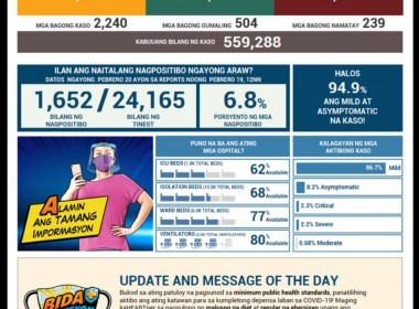 New confirmed cases rise to 2,240 bringing total to 559,288 (Eagle News) — The number of COVID-19 deaths in the country reached 12,069 after 239 fatalities were reported on Saturday, Feb. 20, the highest number of deaths reported in a day so far this year. New confirmed cases also increased to 2,240, the highest daily toll this February, and the second highest this year. This brought the total number of confirmed cases as of […]