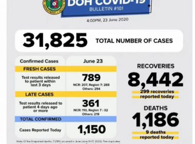 (Eagle News) — Total COVID-19 cases in the Philippines reached 31,825 after a record number of 1,150 cases were added today, Tuesday, June 23, according to the Department of Health. Fresh cases, or those with test results released within the last three days, reached a record-high of 789 cases. Late cases – or those with test results released to patients more than four days ago — reached 361. This was the latest as of […]