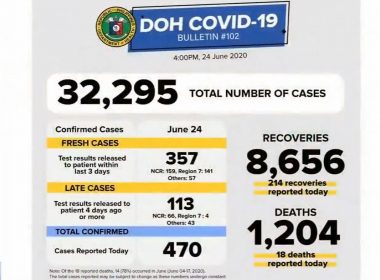 (Eagle News) — The number of COVID-19 cases in the country has reached 32,295 while COVID-19 deaths hit 1,204 as the Department of Health announced that the positivity rate and the COVID-fatality rate have been going down. As of 4 p.m., Wednesday, June 24, there were 470 cases added, 357 of which are fresh cases while 113 were late cases. Most of the new cases added were from Metro Manila: 159 fresh cases and 66 […]