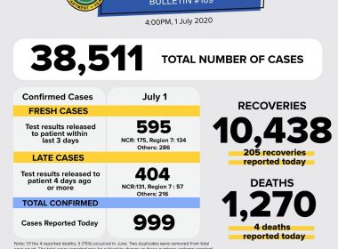 Asymptomatic cases rising, breach 1000 (Eagle News) – COVID-19 cases continued to rise by about a thousand each day for the third straight day as total cases rose to 38,511. Based on data from the Department of Health, 999 cases were added today, July 1, Wednesday, 595 of which were fresh cases while 404 were late cases. Most of the cases added were still from Metro Manila. On Tuesday, June 30, the added cases were […]