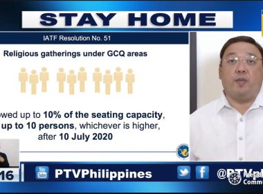 Dry run to be conducted on Sunday, says Roque (Eagle News) – Starting this July 10, religious gatherings will be allowed in areas under General Community Quarantine (GCQ) but only up to 10 percent of the worship service venue’s seating capacity, Malacanang announced today, Friday, July 3. Presidential Spokesperson Harry Roque made the announcement of what had been approved in the latest Inter-Agency Task Force on Emerging Infectious Diseases meeting the previous day, in […]