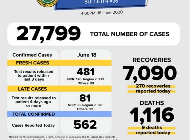 (Eagle News) – The number of COVID-19 recoveries surpassed 7,000 as the Department of Health reported 270 recoveries on Thursday, June 18, as total virus cases in the Philippines reached 27,799. Total COVID-19 recoveries hit 7,090 as the DOH reported daily recoveries of more than 250 in the past few days. But COVID-19 cases added daily continued to increase as well, and mostly were more than 500 recently. As of 4 p.m., there were 562 […]