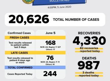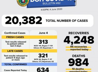 (Eagle News) — The number of coronavirus cases in the Philippines reached 20,382 after 634 cases were added on Thursday, June 4, according to the Department of Health. Fresh cases recorded were 313, with those coming from Metro Manila at 114 and from Central Visayas (Region 7) at 101. Late cases were reported at 321, with 63 infections from repatriates. But even as the COVID-19 cases topped 20,000, the DOH said that the case doubling […]