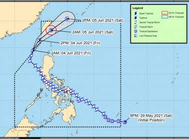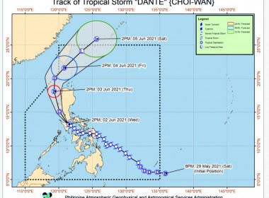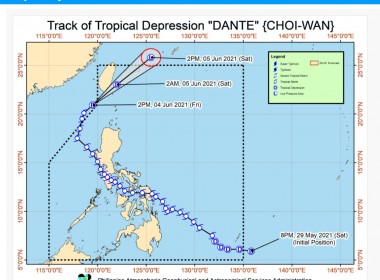 (Eagle News) – Tropical cyclone “Dante” which exited the country early Friday, June 4, re-entered the Philippine Area of Responsibility (PAR) , and is now affecting Batanes which is under signal number 1. Batanes will be experiencing “strong winds” during the passage of Dante, PAGASA said in its 5 p.m. bulletin. The center of Tropical Depression “DANTE” (CHOIWAN) was estimated based on all available data 210 kilometers West Northwest of Basco, Batanes or 185 […]