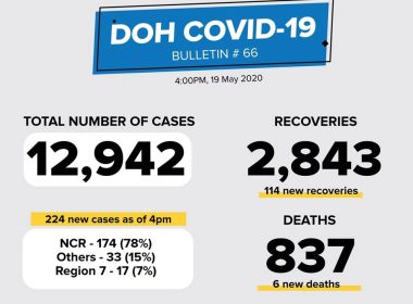 (Eagle News) — The number of coronavirus disease 2019 cases in the country now nears the 13,000 mark, at 12942, with the addition of 224 new cases on Tuesday, May 19. The Department of Health said of the new cases, 78 percent or 174 cases came from Metro Manila; 15 percent or 33 cases from other areas; and 7 percent or 17 cases from Region 7. Recoveries continued to increase, at 2,843, with the addition […]