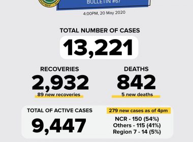 (Eagle News) — The number of coronavirus disease 2019 cases in the country has breached the 13,000 mark and is now at 13,221. The Department of Health on Wednesday, May 20, said of the 279 new cases, 54 percent or 150 came from the National Capital Region; 41 percent or 115 cases from other areas; and five percent or 14 cases from Region 7. Eighty-nine new recoveries were reported, bringing the total to 2932. The […]