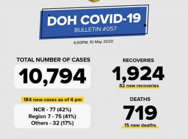 (Eagle News)–The number of coronavirus disease 2019 cases in the country has reached 10794, with the addition of 184 cases on Sunday, May 10. The Department of Health said of the new cases, 42 percent or 77 came from Metro Manila, 41 percent or 75 from Region 7 and 17 percent or 32 from other areas. Recoveries neared the 2000 mark, at 1924, with 82 new ones. The death toll stood at 719 with 15 […]