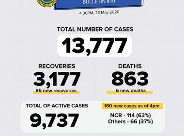 (Eagle News)–The number of COVID19 cases in the country has climbed to 13777 after the Department of Health reported 180 additional cases on Saturday, May 23. The DOH said of the new cases, 63 percent or 114 cases were from Metro Manila; and 37 percent or 66 cases were from other areas. Recoveries increased to 3177 with the 85 new ones. Six new deaths were recorded, bringing the total to 863. The government has placed […]