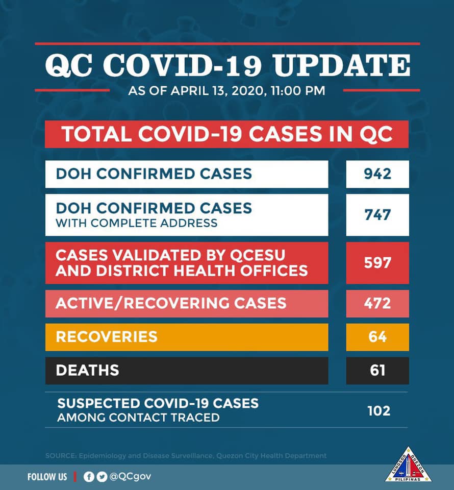 (Eagle News) -- The number of coronavirus disease 2019 cases in Quezon City has reached 942. The local government said…